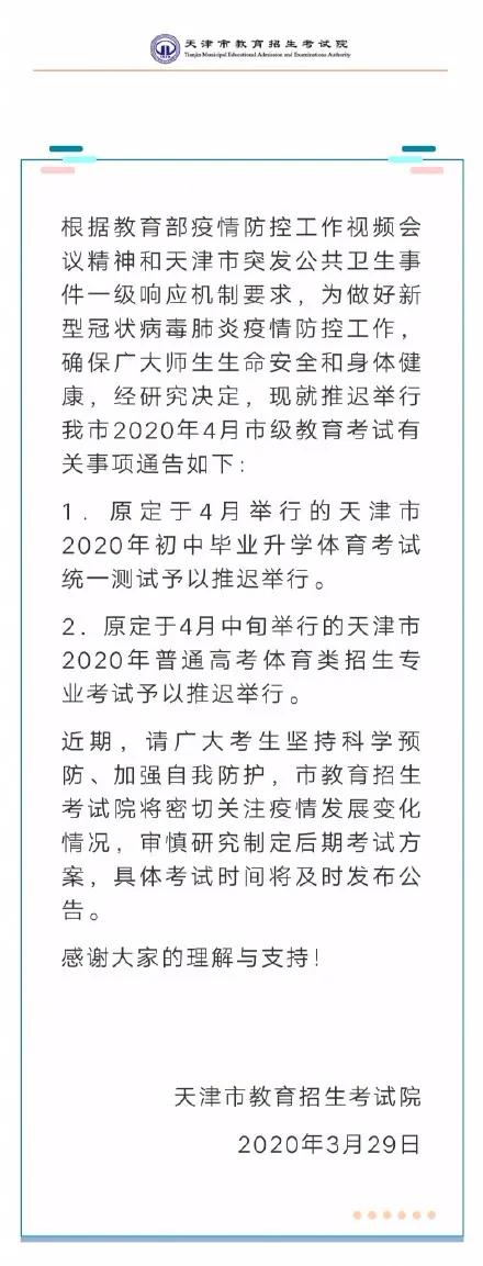 3月29日,天津市教育招生考试院发布《关于推迟举行我市2020年4月市级教育考试的公告》。公告指出,将推迟原定于4月举行的天津市2020年初中毕业升学体育考试统一测试。同时,原定于4月中旬举行的天津市2020年普通高考体育类招生专业考试也将推迟举行。